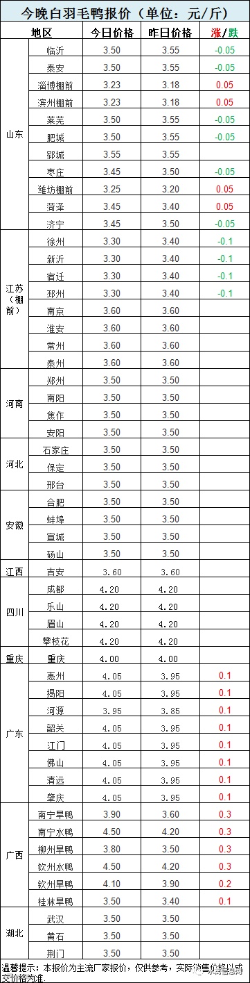 今晚樱桃谷毛鸭报价:北方分割鸭区域,山东地区涨跌不一,苏北沦陷下跌,其他区域暂稳。活禽区域,两广开启回归模式报价回调。