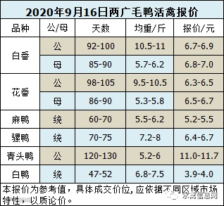 2020年9月16日晚至9月17日毛鸭报价