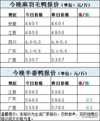 今晚麻鸭报价稳定。半番鸭类弱势,局部下调。