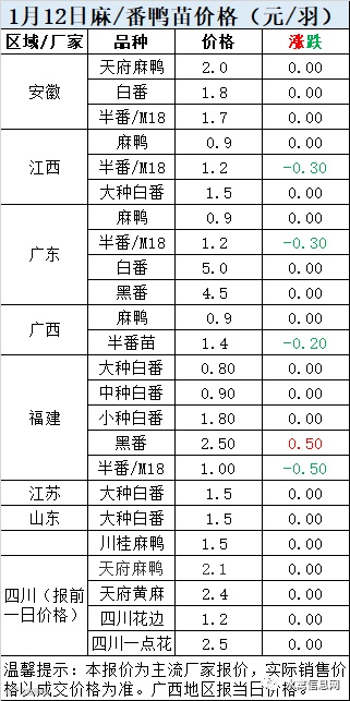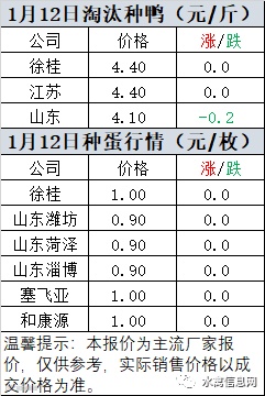 一、2021年1月12日白羽鸭苗报价;