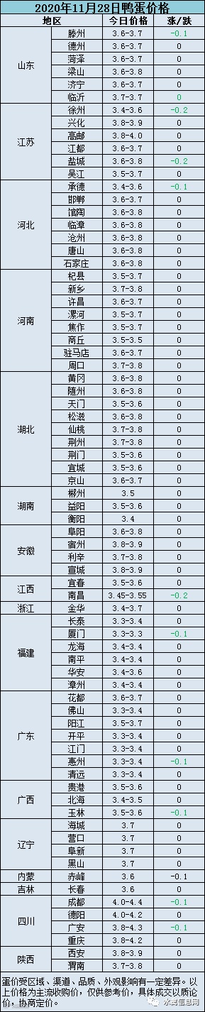 2020年11月28日淘汰蛋鸭价格参考值:活禽6.5-7.0元/斤、屠宰6.0-6.7元/斤。受肉鸭活禽价格下跌影响叠加淘鸭增多种鸭淘汰乱市,淘汰蛋鸭持续弱势震荡,走货较慢。