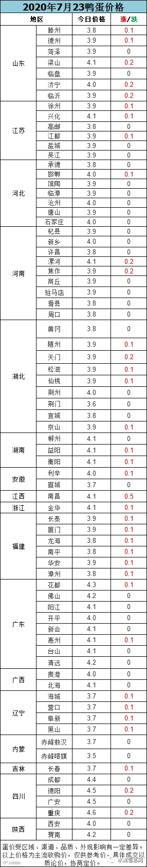 【鸭蛋报价】2020年7月23日鸭蛋价格,供应收缩,稳步上涨。