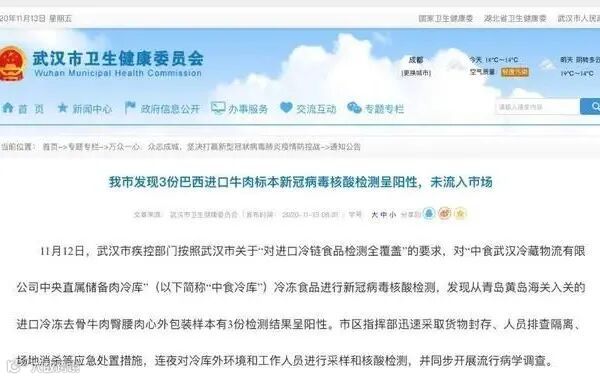 11月12日,武汉市疾控部门按照武汉市关于“对进口冷链食品检测全覆盖”的要求,对“中食武汉冷藏物流有限公司中央直属储备肉冷库”(以下简称“中食冷库”)冷冻食品进行新冠病毒核酸检测,发现从青岛黄岛海关入关的进口冷冻去骨牛肉臀腰肉心外包装样本有3份检测结果呈阳性。