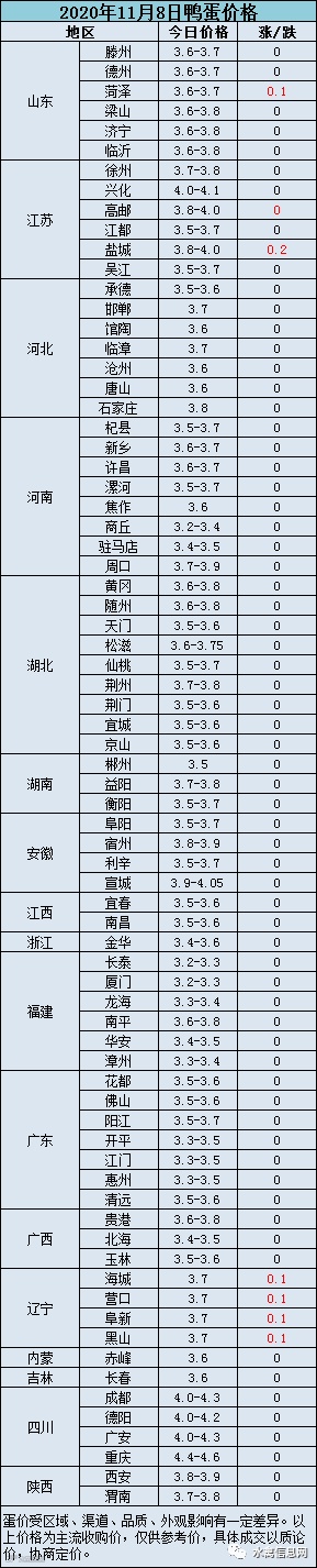 今日蛋价综述:今日鸭蛋市场报价整体稳定,北方河南、河北、山东、江苏实收价开始陆续回升。低价区均价3.3元/斤,高价区均价3.6元/斤。