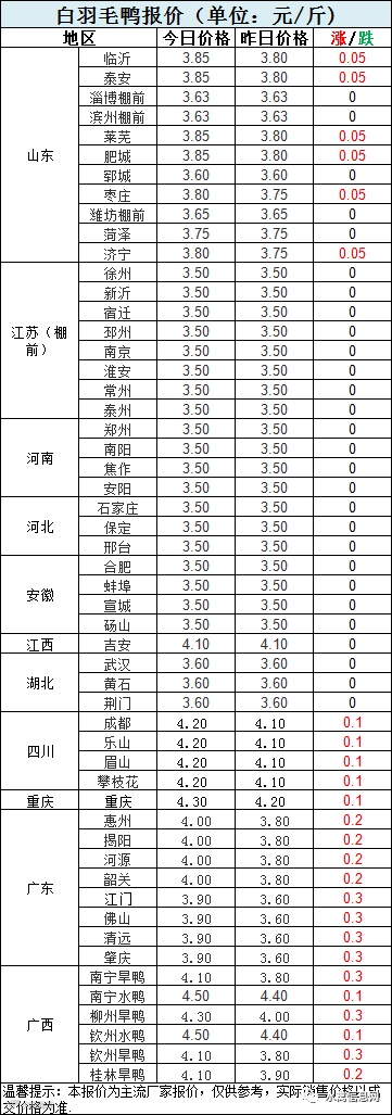 1:今晚北方分割鸭区域报价,山东继续上涨,其他区域报价暂稳。北方市场以合同鸭为主,毛鸭价格受冷藏成本与冻品价格影响,近期冷藏压力略有好转,市场鸭收购较主动,但考虑整体消费市场依然严峻,预计这轮上涨幅度依然有限。