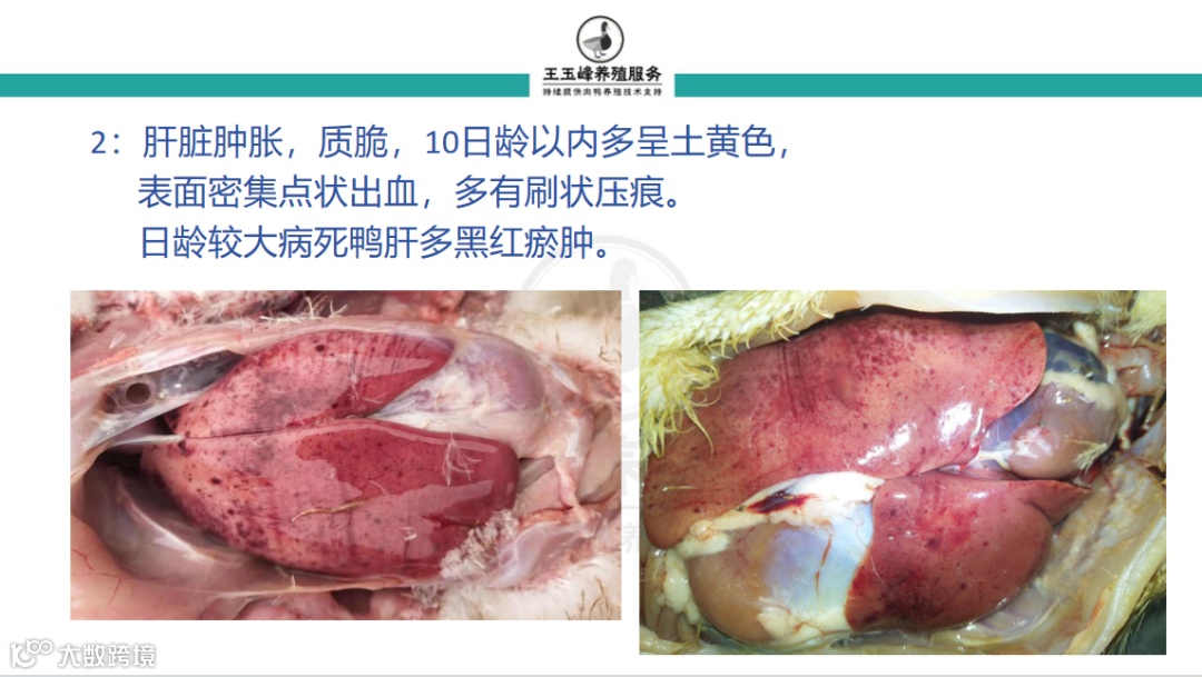 死鸭肝肿黄间红,出血密集刷状呈。