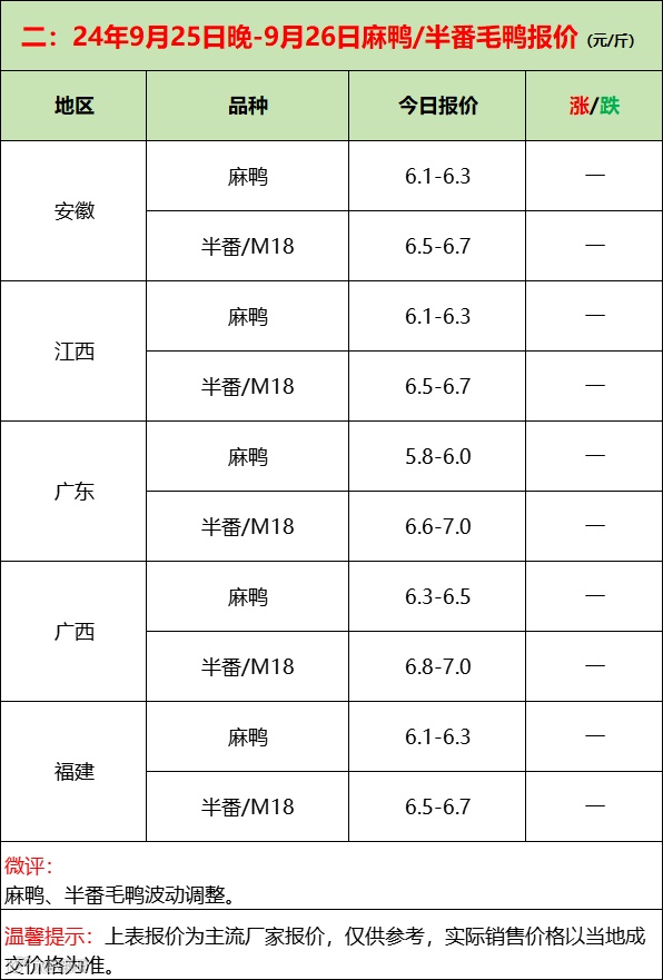 鸭苗落后走稳,毛鸭偏弱阴跌,行业结构性矛盾突出!--2024年9月26日水禽行情简报
