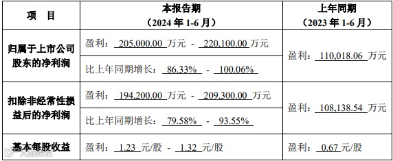 期,公司实现归属于上市公司股东的净利润20.50亿元至22.01亿元,同比增长86.33%至100.06%。
