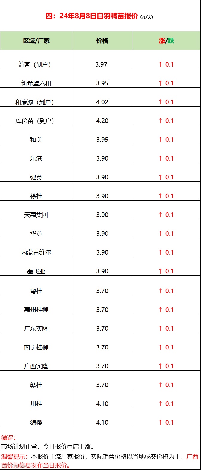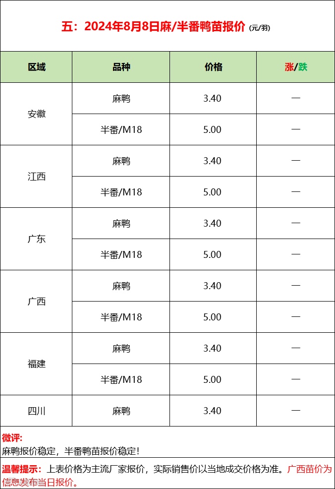 鸭苗继续上涨;产品局部波动;--2024年8月8日水禽行情简报 益牧堂水禽信息