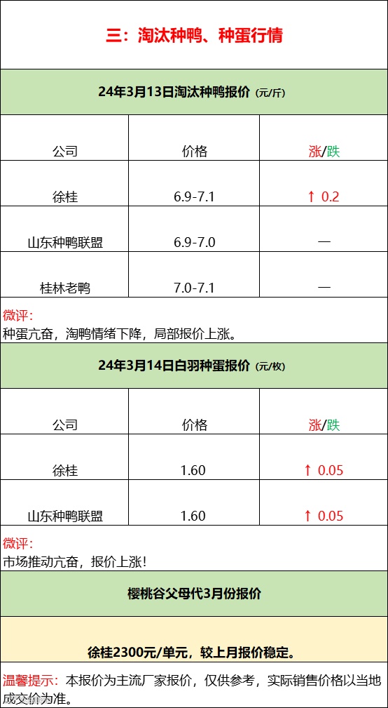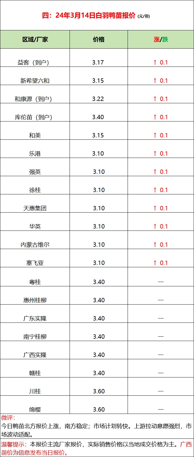 今日鸭苗市场报价北方试涨,南方稳定;当前上游略有亢奋,拉涨情绪走强,整体市场还在适配范围内,计划顺畅;但当前市场承受度较差,拉涨程度支撑有限。
