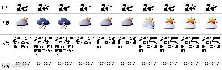 13日我市多云,有(雷)阵雨,局部可达暴雨,强降雨易出现在清晨至上午和午后,气温27-33℃;
