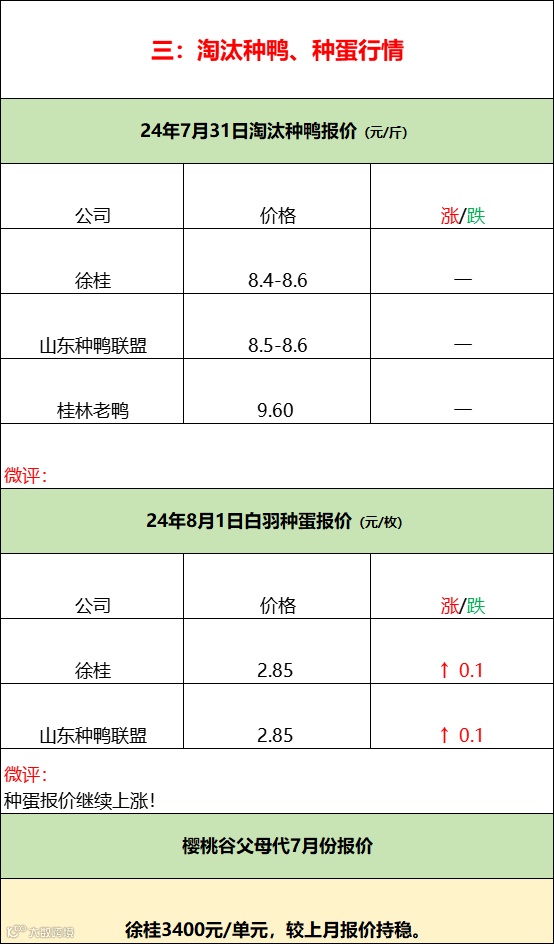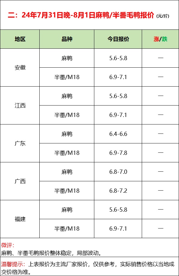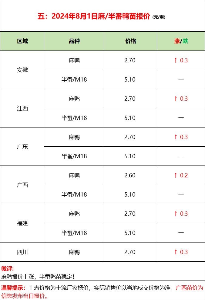 高温暴雨减产,鸭苗连续上涨;--2024年8月1日水禽行情简报
