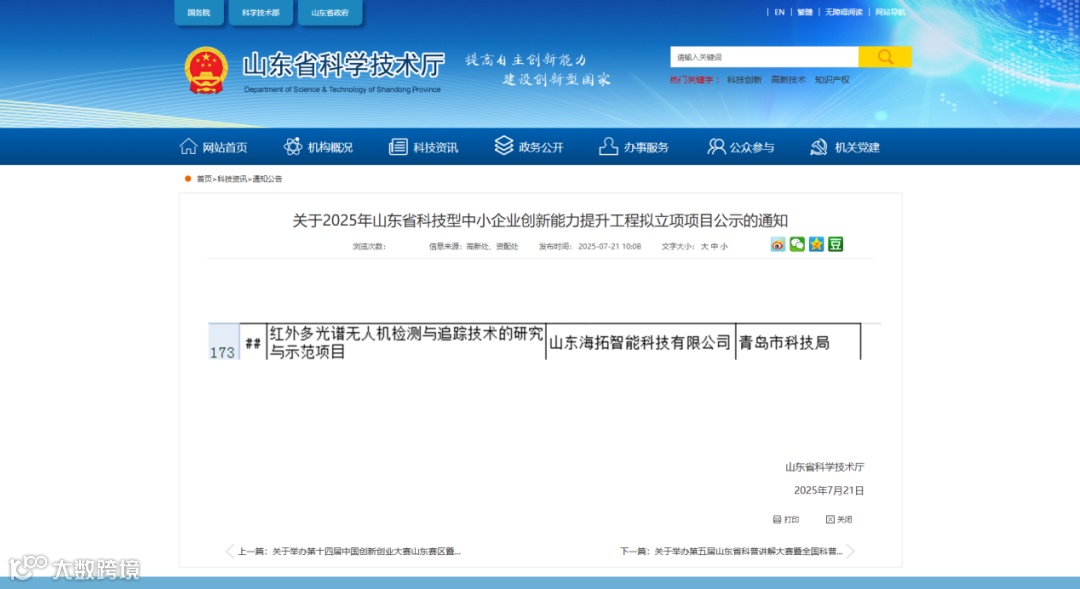 近日,山东省科技厅公布了2025年度“科技型中小企业创新能力提升工程”立项名单,海拓智能凭借其前瞻性布局和扎实的技术积累,其核心研发项目--“红外多光谱无人机检测与追踪技术的研究与示范项目” 从众多申报项目中脱颖而出,成功入选!这不仅是对海拓智能创新实力的权威认可,更是公司深耕智能感知与无人机应用领域,向科技前沿迈出的坚实一步。