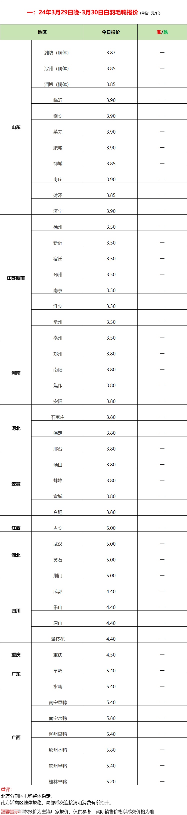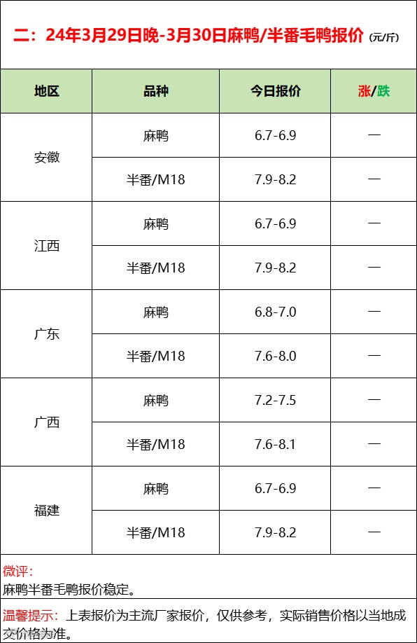 北方毛鸭报稳为主,屠宰以合同为主,对市场鸭支撑有限。南方活禽区临近清明消费期成交转强。