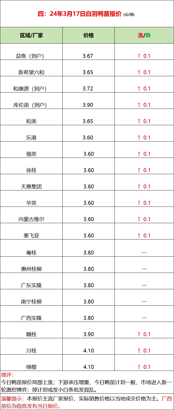 今日鸭苗局部上涨;下游承压,市场争夺趋于激烈;今日鸭苗计划一般,掉计划或发小白条混乱低走。种蛋降温局部低走。