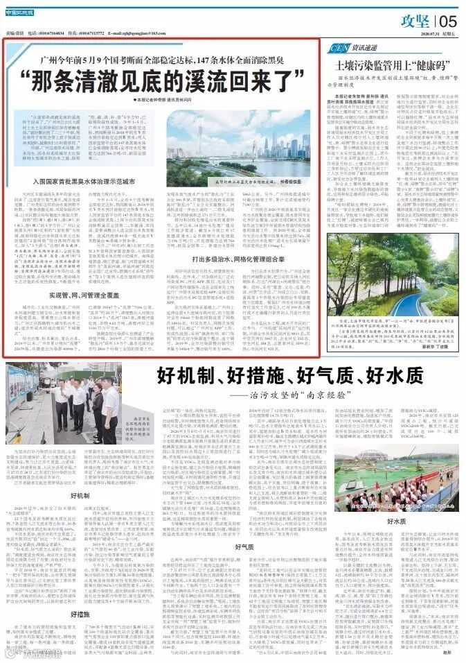 目前,广州这座依水而建、伴水而生、因水而美的城市正在探路特大型城市的治水之道,按照“控、截、清、补、管”5字方针,已取得阶段性成效。今年1-5月,广州9个国考断面全部稳定达标,鸦岗断面从2018年的劣Ⅴ类水到目前稳定达到Ⅳ类水;列入国家监管平台的147条黑臭水体已全面消除黑臭;全市污水处理能力达到766万吨/日,跃居全国第二。