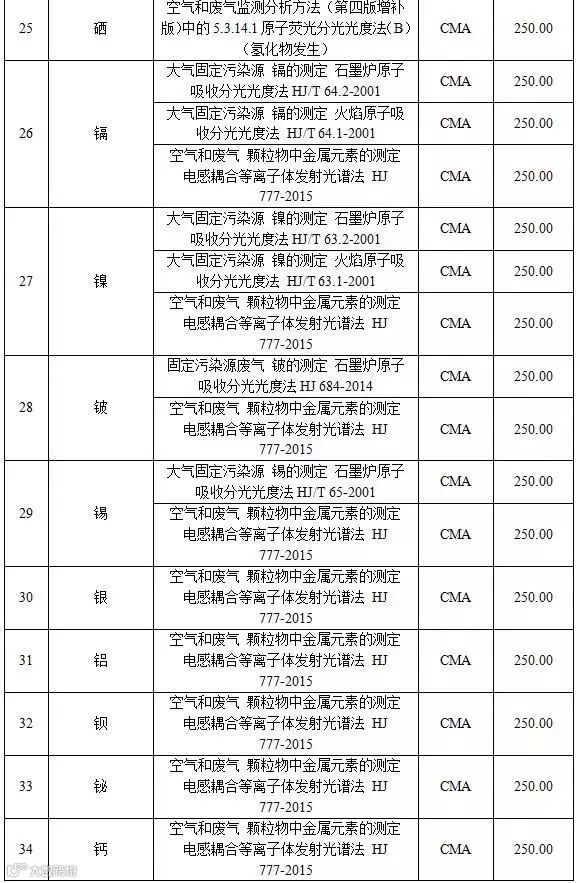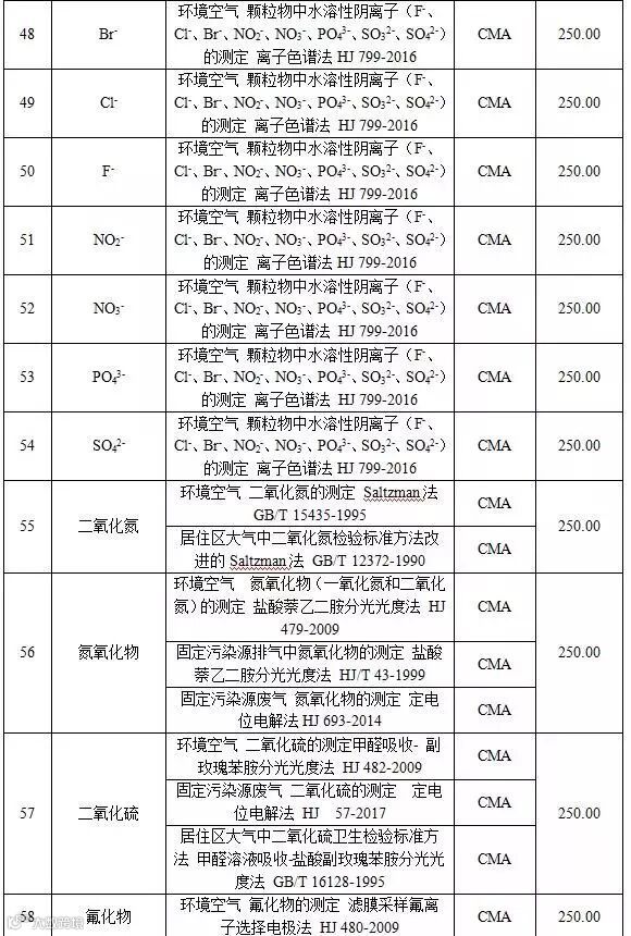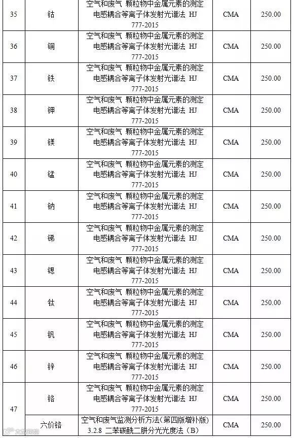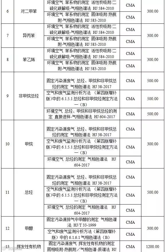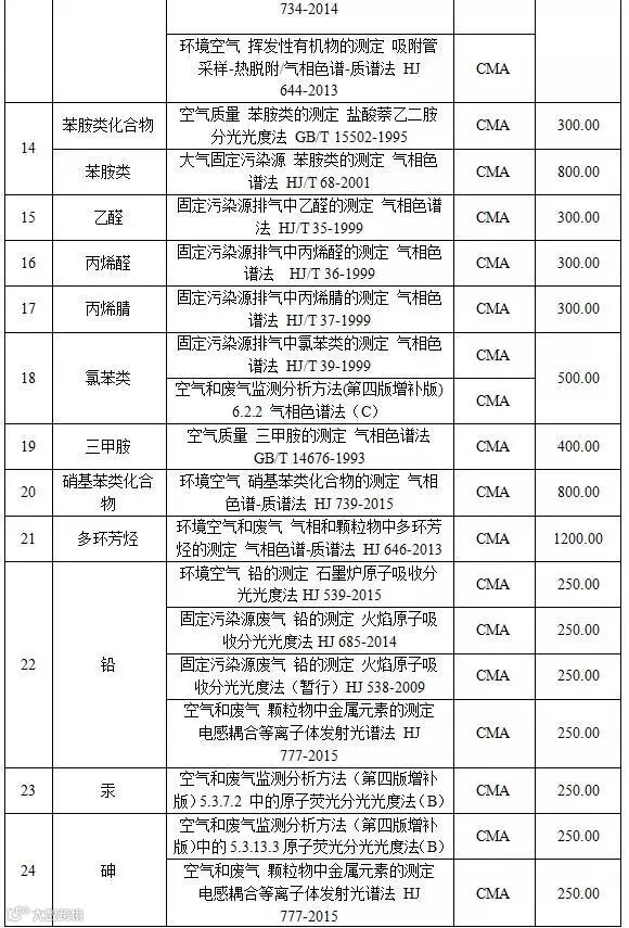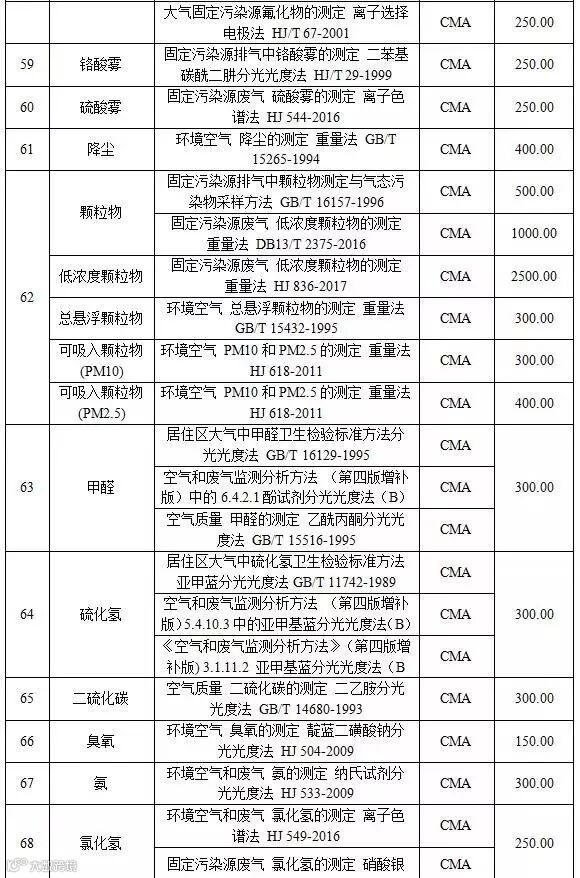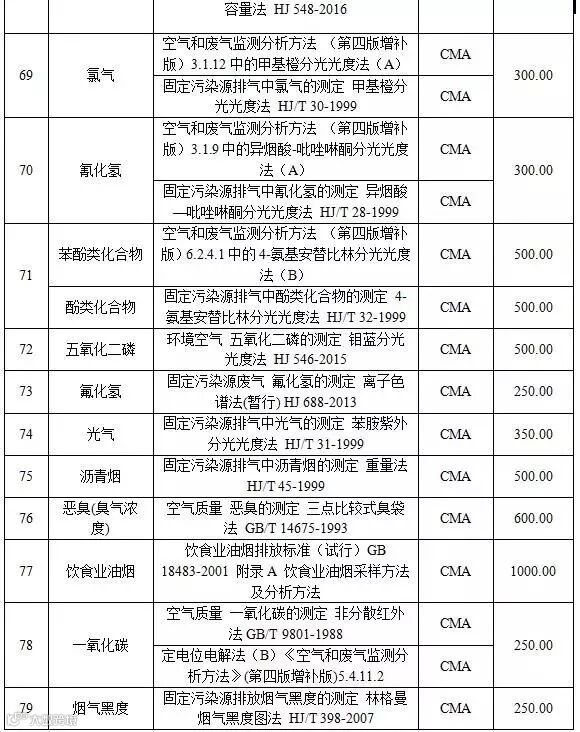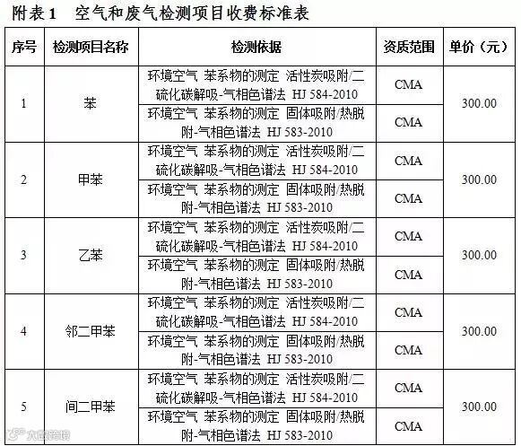 附表1 空气和废气检测项目收费标准表