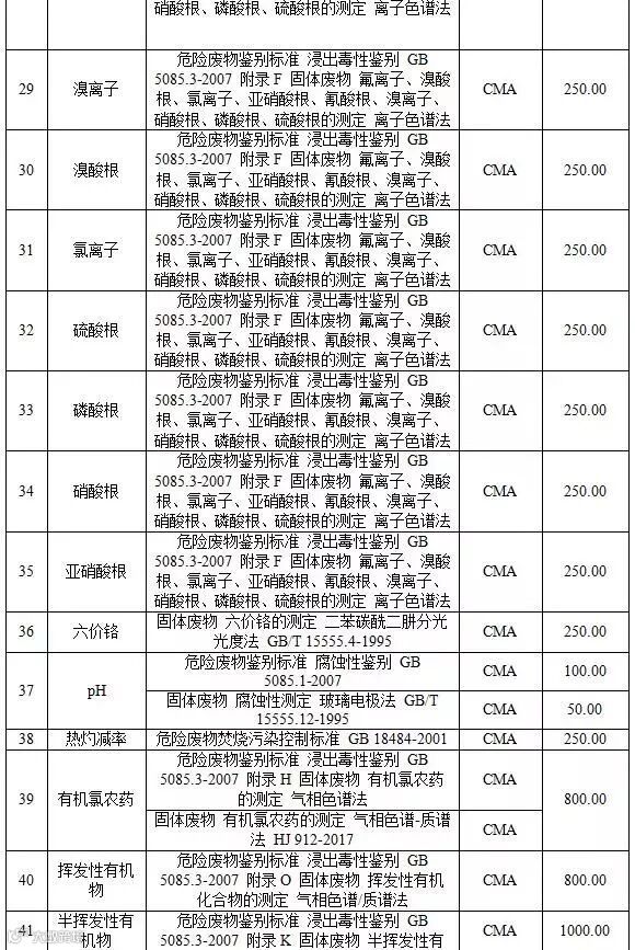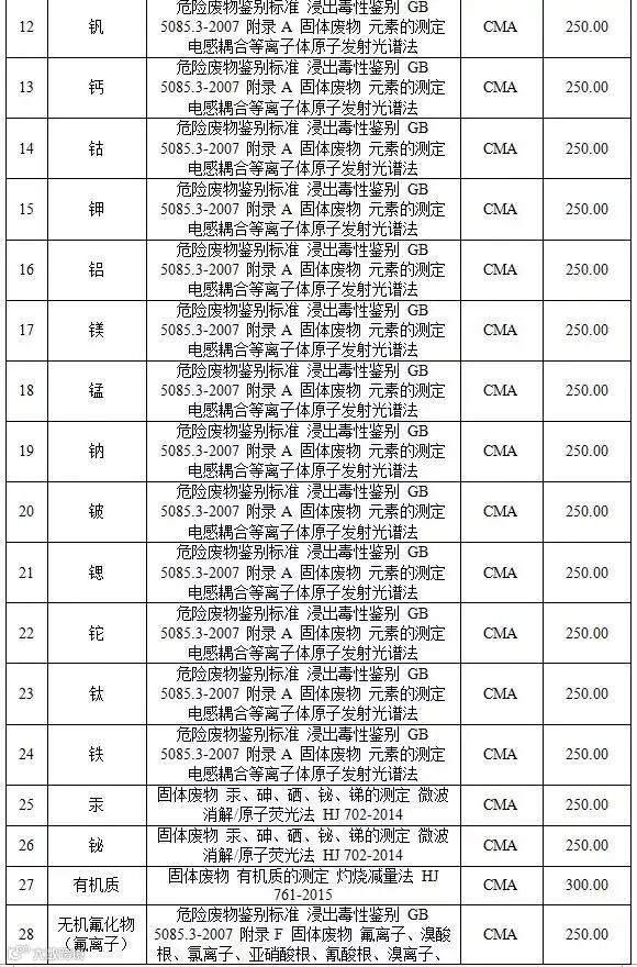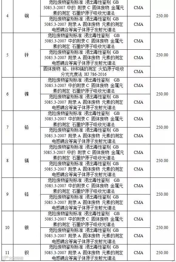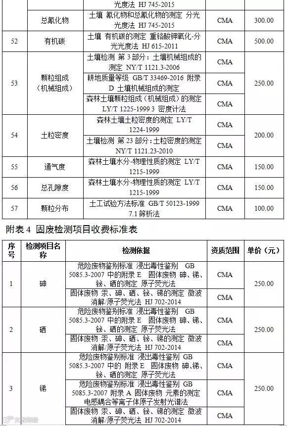 附表4 固废检测项目收费标准表