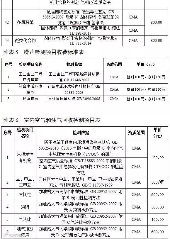 附件6 室内空气和油气回收检测项目收费标准表