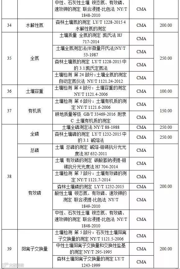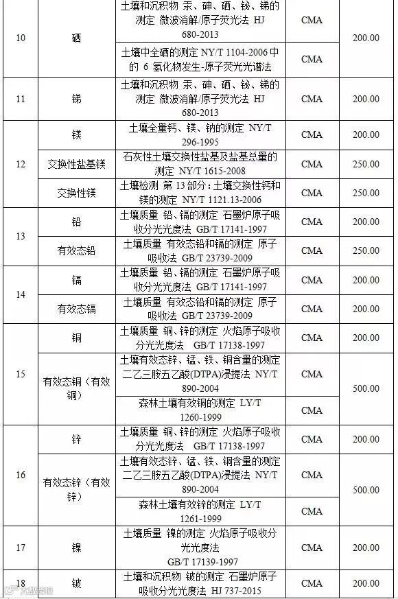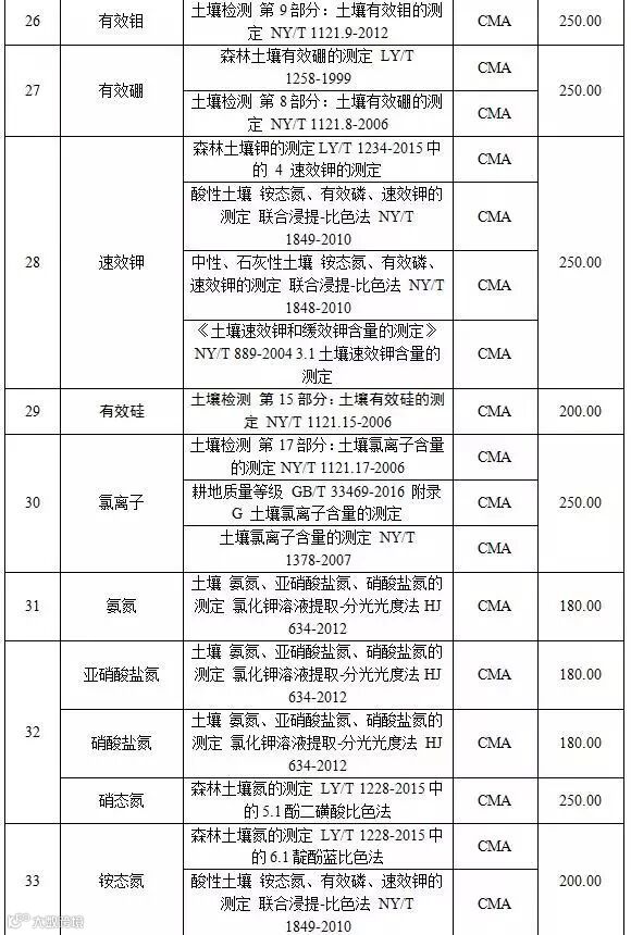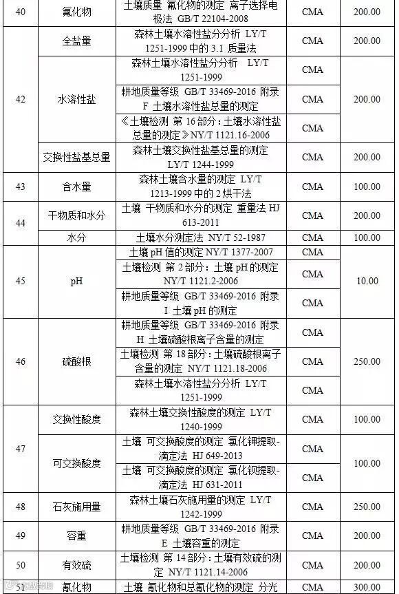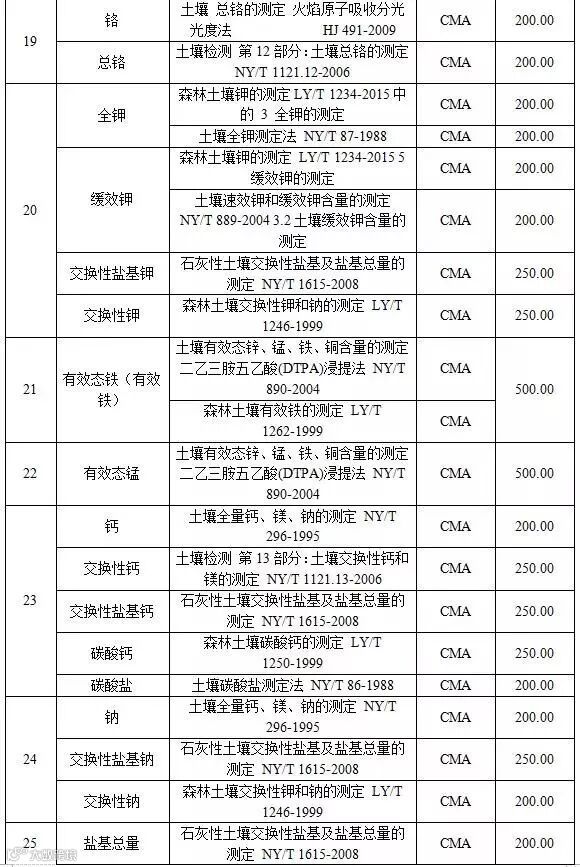 附表3 土壤检测项目收费标准表
