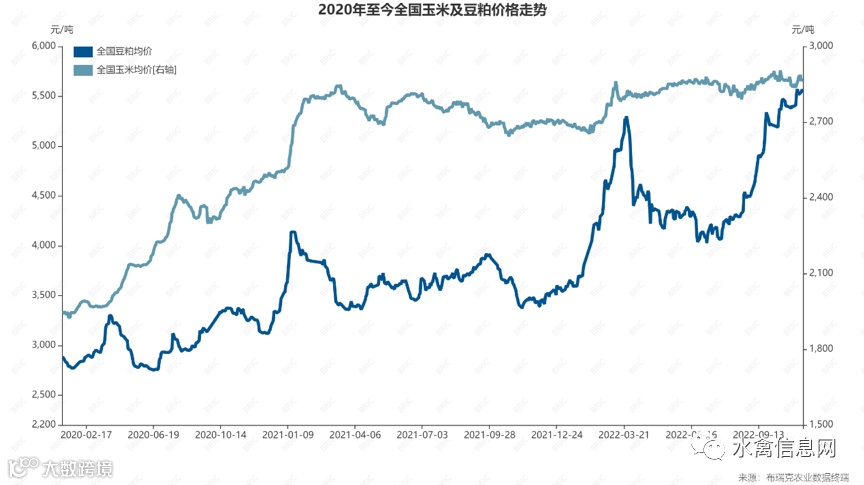 2020年至今全国玉米及豆粕价格走势,图片:布瑞克大数据