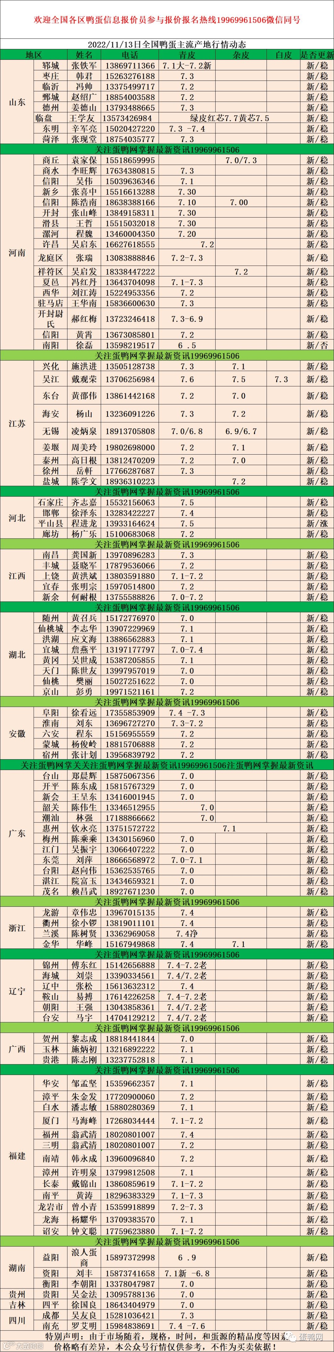 2022年11月13日:老鸭蛋7.2元,初产至10个头7元,10个头至大蛋7.4元。