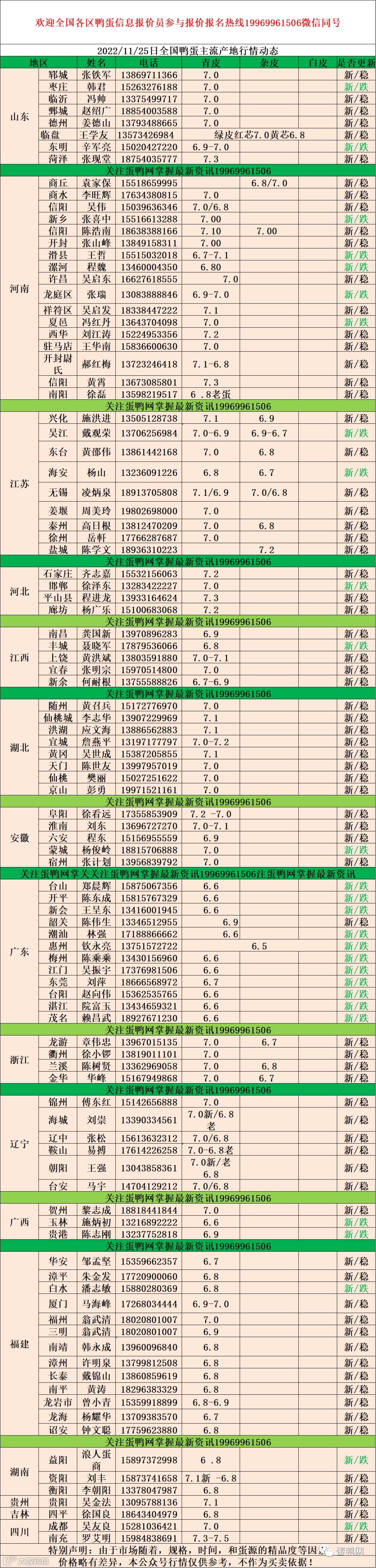 2022年11月25日:初产至10个头6.2元,10个头至9个头6.6元,9个头至8个6.8元,8个头至大蛋7.0元。老鸭蛋6.8元。