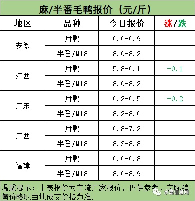 麻鸭苗报价平稳;半番鸭苗报价下滑。
