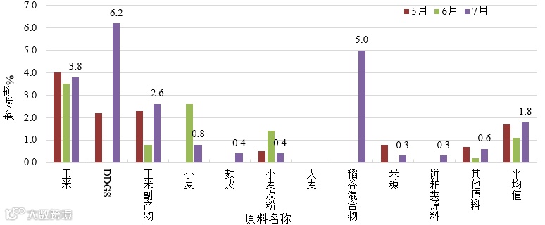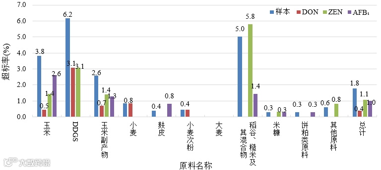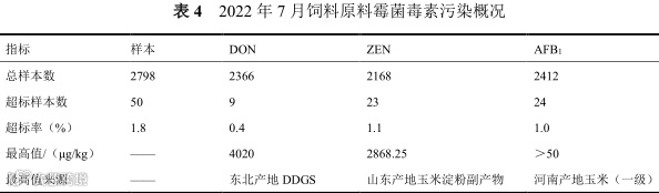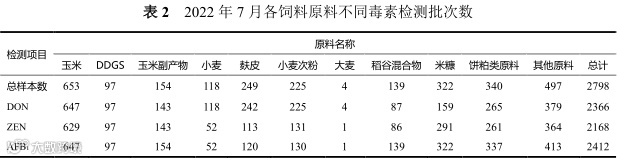 2022年7月,安佑集团共检测饲料原料样本2798份(表1),对大部分原料中呕吐毒素(DON)、玉米赤霉烯酮(ZEN)、黄曲霉毒素B1(AFB1)3种毒素进行检测,同时根据不同样品受霉菌毒素污染的特点,侧重检测了某种毒素,检测数据共6946项,其中DON 2366项,ZEN 2168项,AFB1 2412项 (表2)。