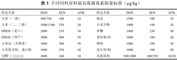 三种霉菌毒素限量标准见表3,样品毒素含量超过最高限量值,即判定为超标样。