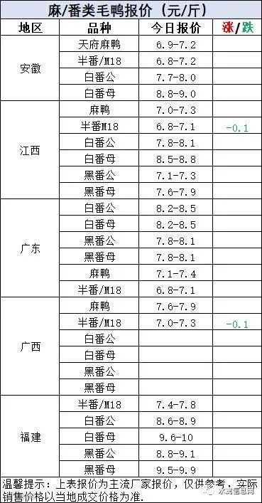 麻鸭苗报价稳定;半番鸭苗报价上调0.1元/羽;