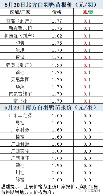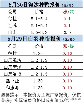 一、5月29日晚至5月30日 白羽肉鸭报价