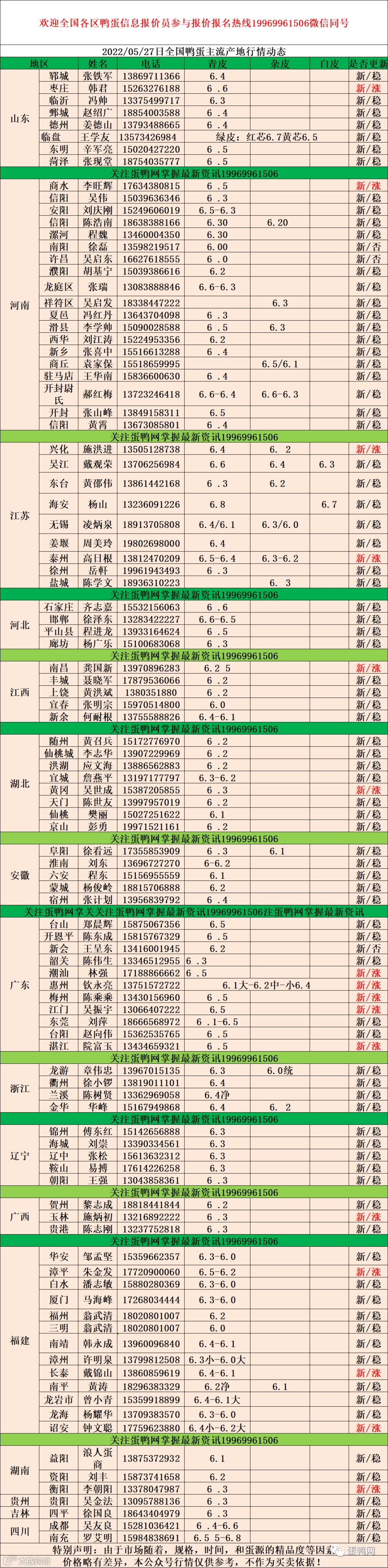 导读:2022年05月27日鲜鸭蛋价格:初产至10个头6.1元,10个头至9个6.2元,9个头至大蛋6.3元(参考
