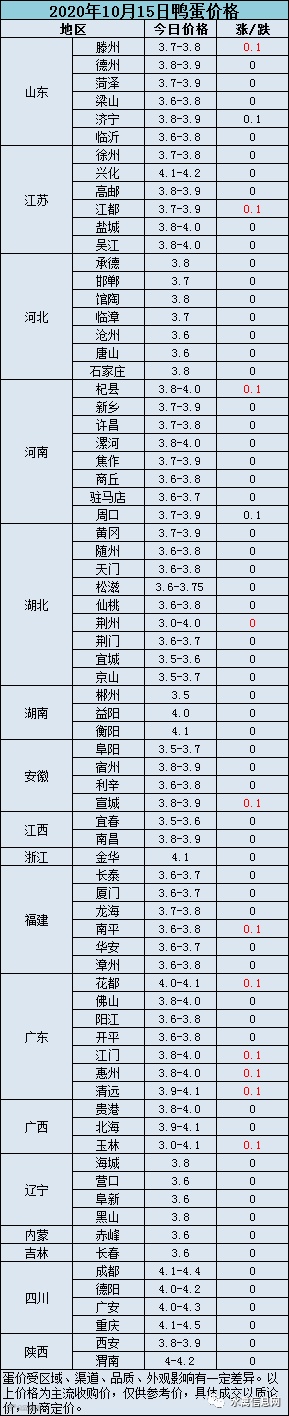 2020年10月15日淘汰蛋鸭价格参考值:6.2元/斤。受肉鸭活禽价格下跌影响叠加淘鸭增多种鸭淘汰乱市,淘汰蛋鸭持续弱势震荡。