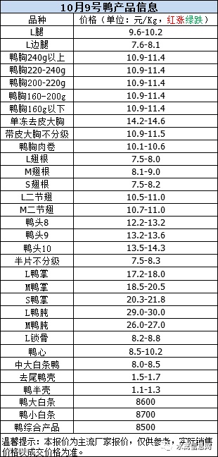 一、10月9日晚至10日 白羽肉鸭报价
