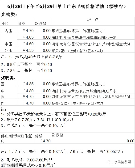 2020年6月28日下午至6月29日上午毛鸭报价