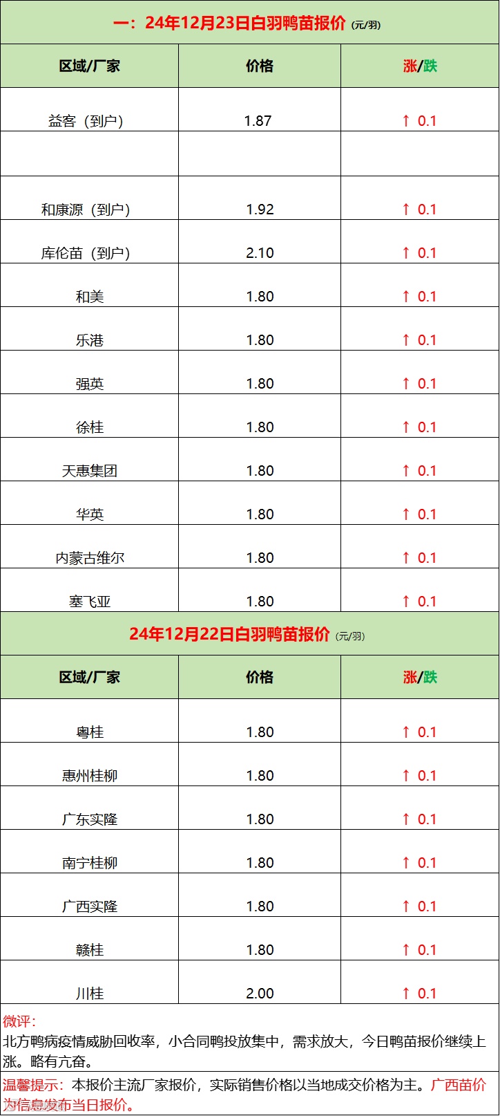 苗蛋亢奋上升,产品平淡弱稳!--2024年12月23日水禽行情简报 益牧堂水禽信息