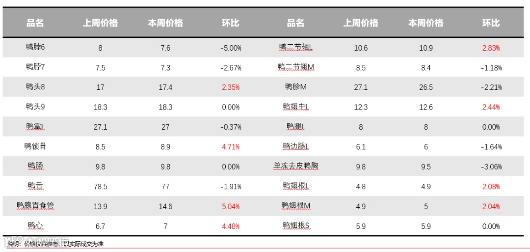 上游屠宰端表现:本期屠宰开工率在98%,环比上涨+2个百分点。周内毛鸭成本下降,屠宰企业收购积极性加强,开工率上涨;本周毛鸭市场供应基本持平,预估开工率或为稳定。