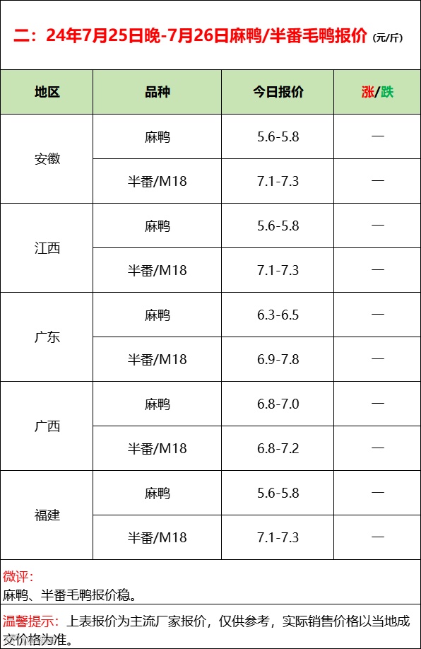 鸭苗转向下滑,产品局部推涨;--2024年7月26日水禽行情简报