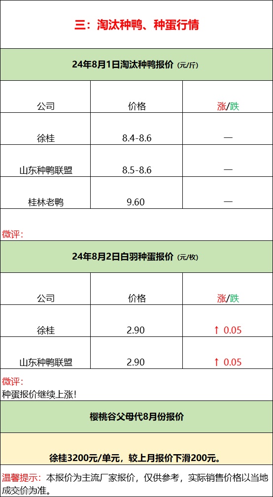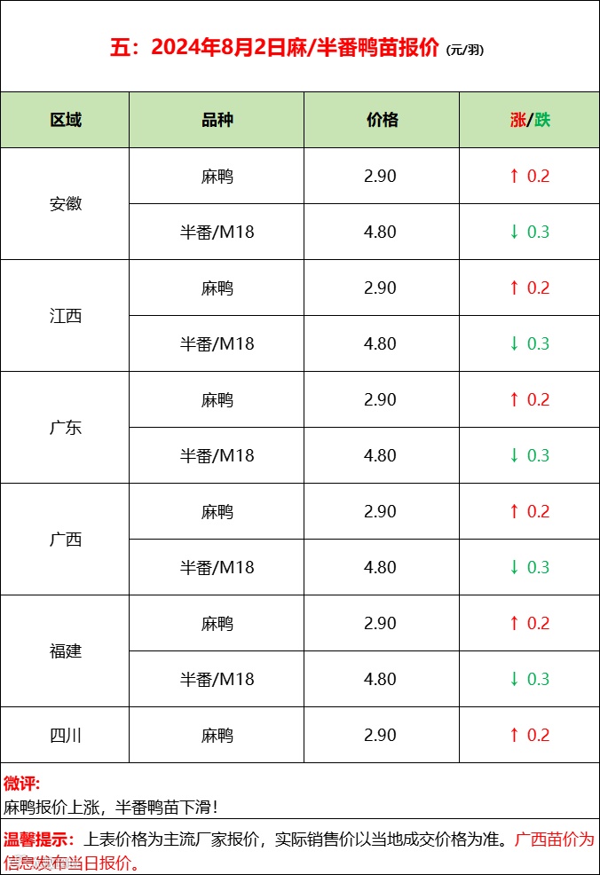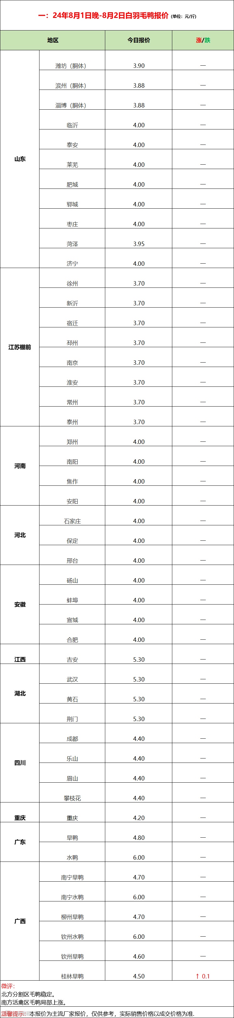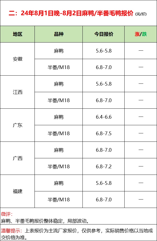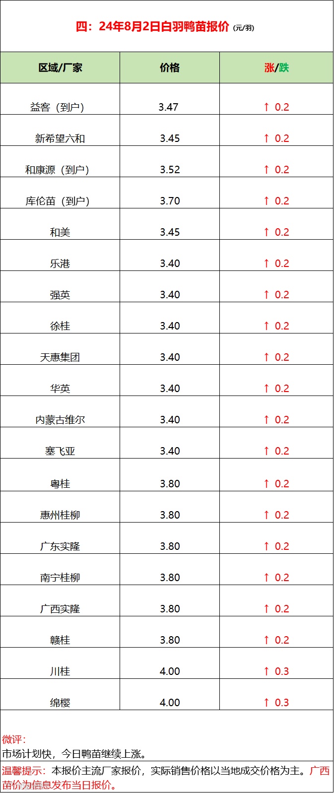 鸭苗再涨2毛,产品平稳难涨;--2024年8月2日水禽行情简报