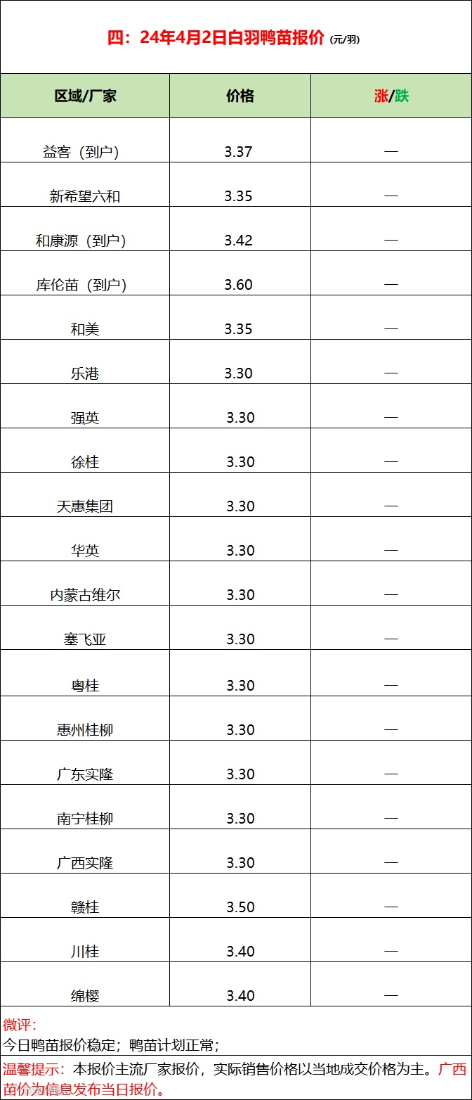今日鸭苗报价整体平稳,鸭苗计划正常,供需对峙相持。