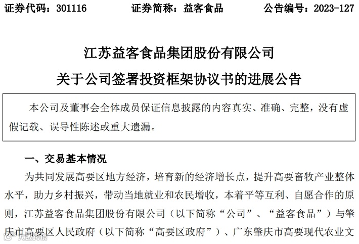 2024年1月2日,益客食品发布了《关于公司签署投资框架协议书的进展公告》,表示与肇庆市高要现代农业文化旅游投资有限公司签署了《投资框架协议书》,共同推动投资兴建 " 粤港澳大湾区(高要)亿只高桂鸭全产业链项目 "。
