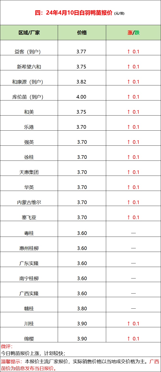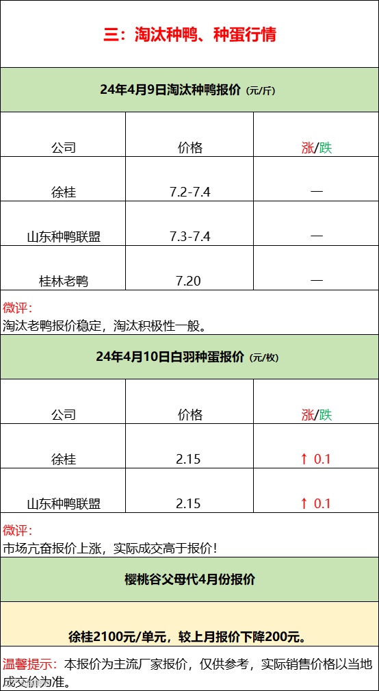 今日樱桃谷鸭苗报价上涨,市场计划较快;孵化情绪亢奋,种蛋成交高走。