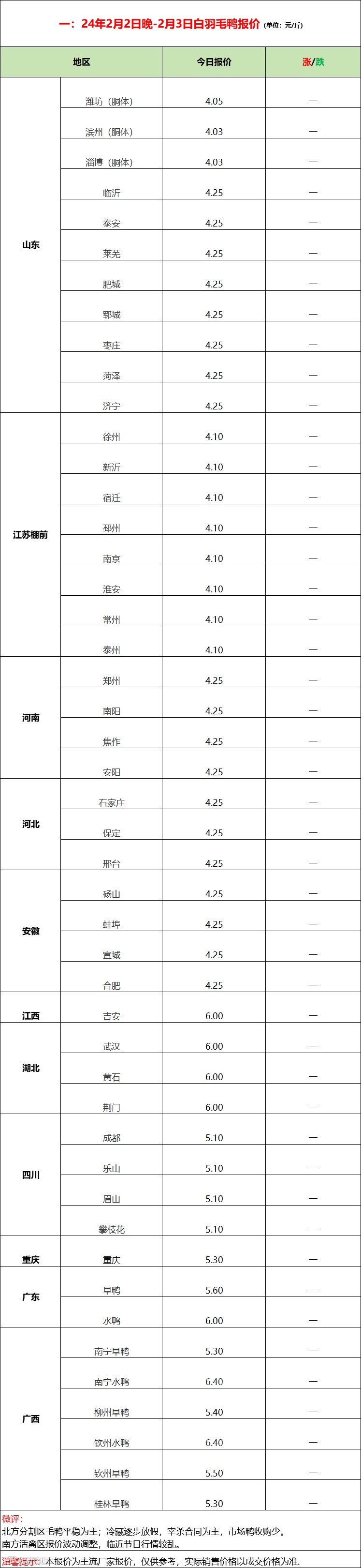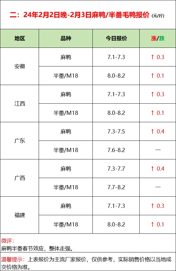 北方分割区毛鸭平稳为主,冷藏逐步放假,以宰杀合同为主,市场鸭收购偏少。南方活禽区节日效应,市场活跃,白鸭波动局部偏弱,麻番毛鸭整体走强。