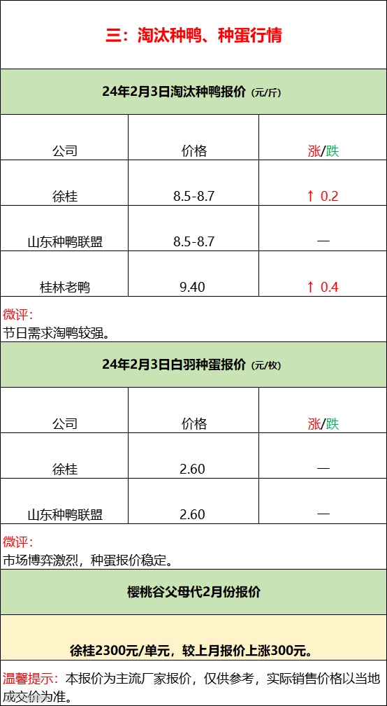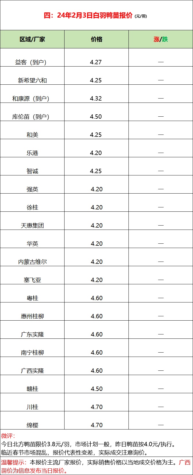 今日北方鸭苗限价3.8元/羽,市场计划一般,昨日鸭苗按4.0元/羽执行。临近春节市场混乱,报价代表性变差,实际成交注意当地询价。