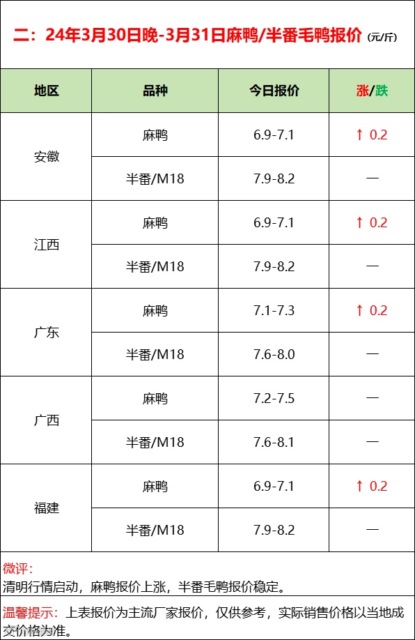 北方毛鸭报稳为主局部小幅抬头,北方屠宰以合同为主,对市场鸭支撑有限。南方活禽区临近清明消费期成交转强。