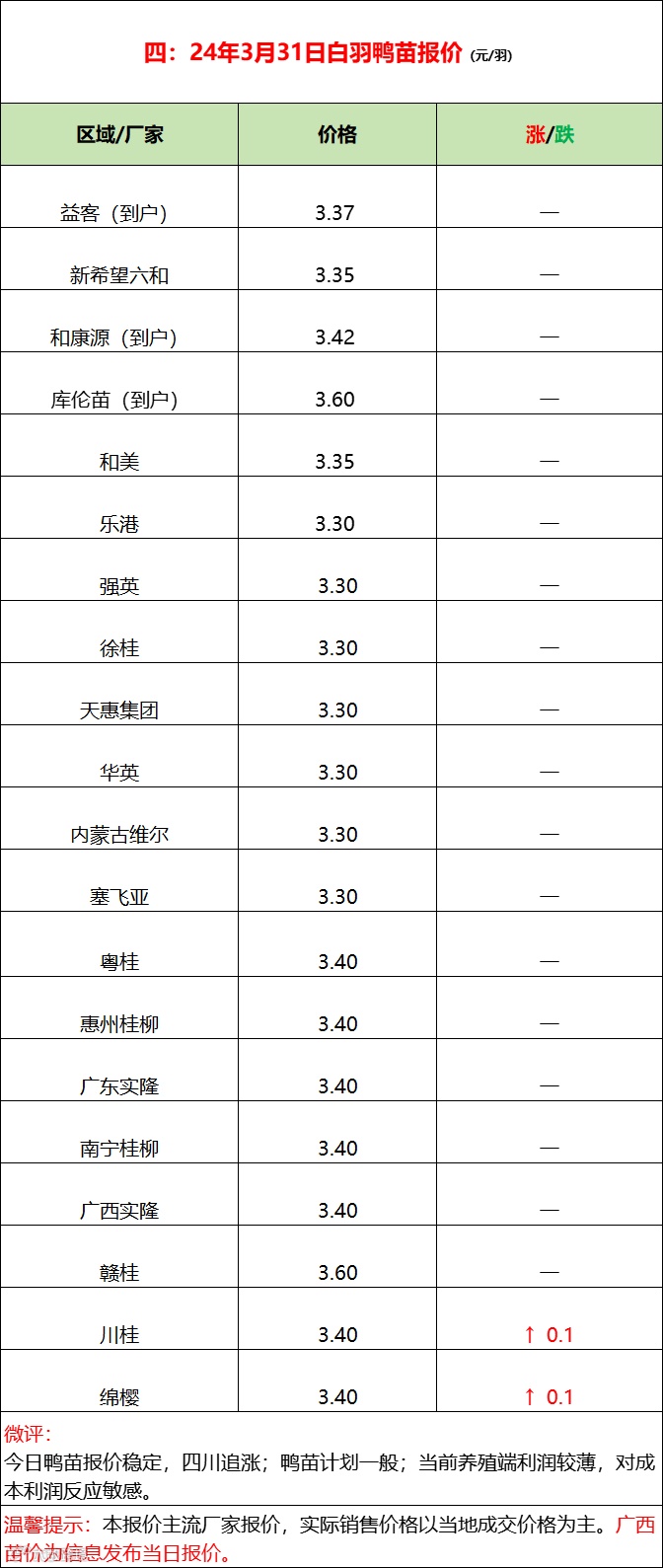 今日鸭苗报价四川追涨,整体报稳;北方鸭苗计划一般,养殖对价格敏感。