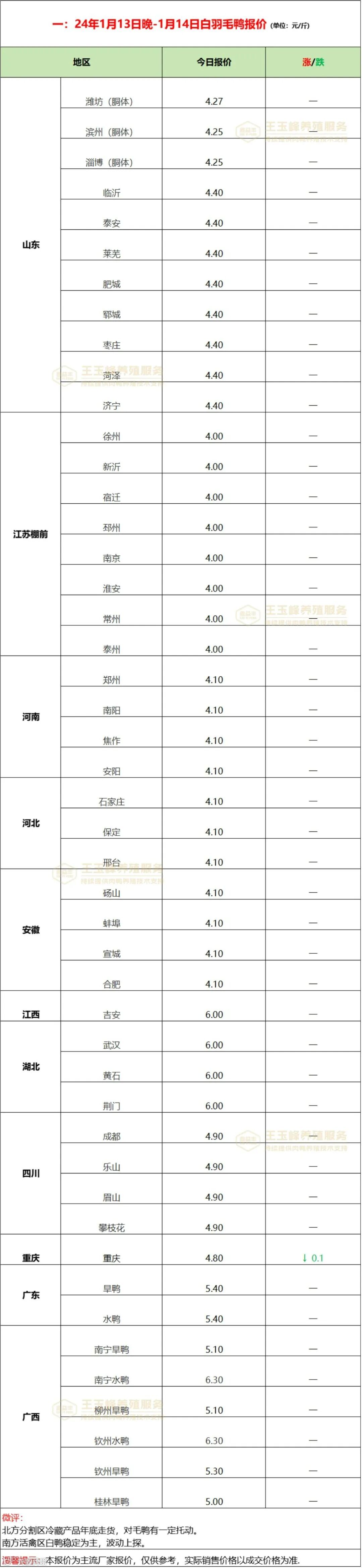 毛鸭整体平稳为主;北方分割区产品推涨势头放缓,毛鸭市场收购量较小,整体平稳调整。