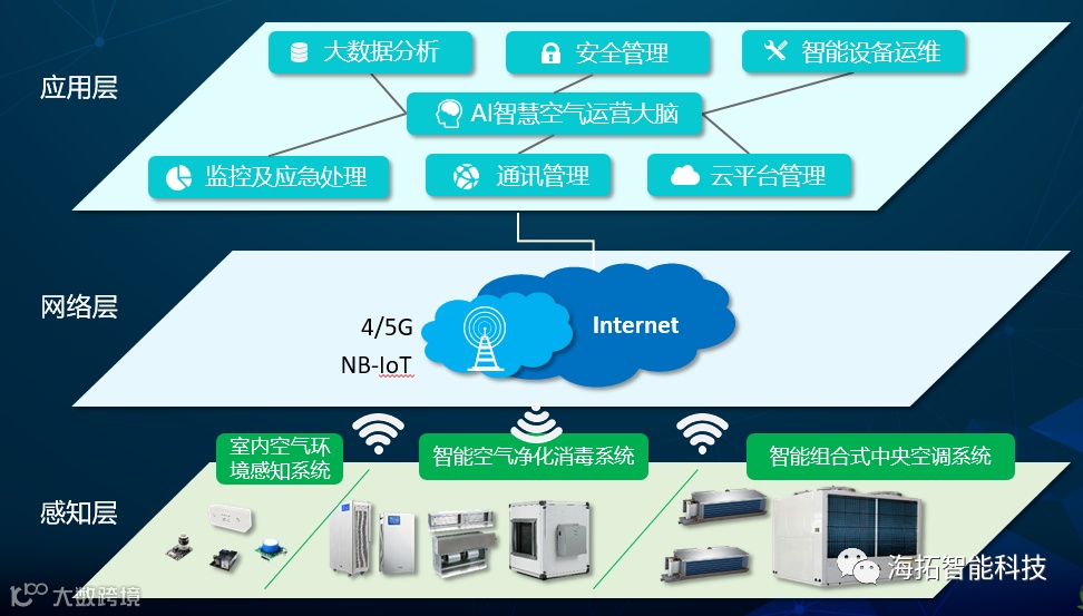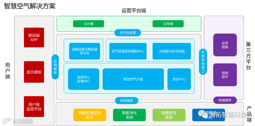 管理控制平台。核心理念是整合室内空气净化、暖通、新风等系统,通过5G+NB-IOT技术,采集室内空气质量,结合不同场景的空气质量管理要求;以智能化、物联网化的终端产品为基础,智能化运营平台为支撑,达成对室内空气质量低功耗、高效能的运营管理,最终实现全面提高各场所的空气质量水平,降低各类可经空气传播流行疾病传播机率的目的。未来将能成为智慧城市的重要组成,为广大人民群众的工作学习生活提供安全、健康、舒适空气的保障。