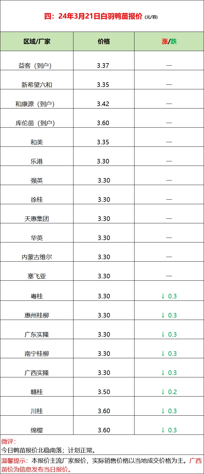今日鸭苗报价北稳南落,鸭苗计划正常。